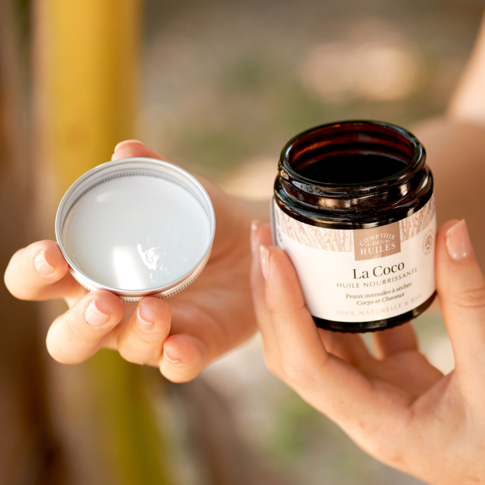 L'huile de Coco aide à réparer les cheveux secs et fragiles. Elle va nourrir et fortifier les cheveux.